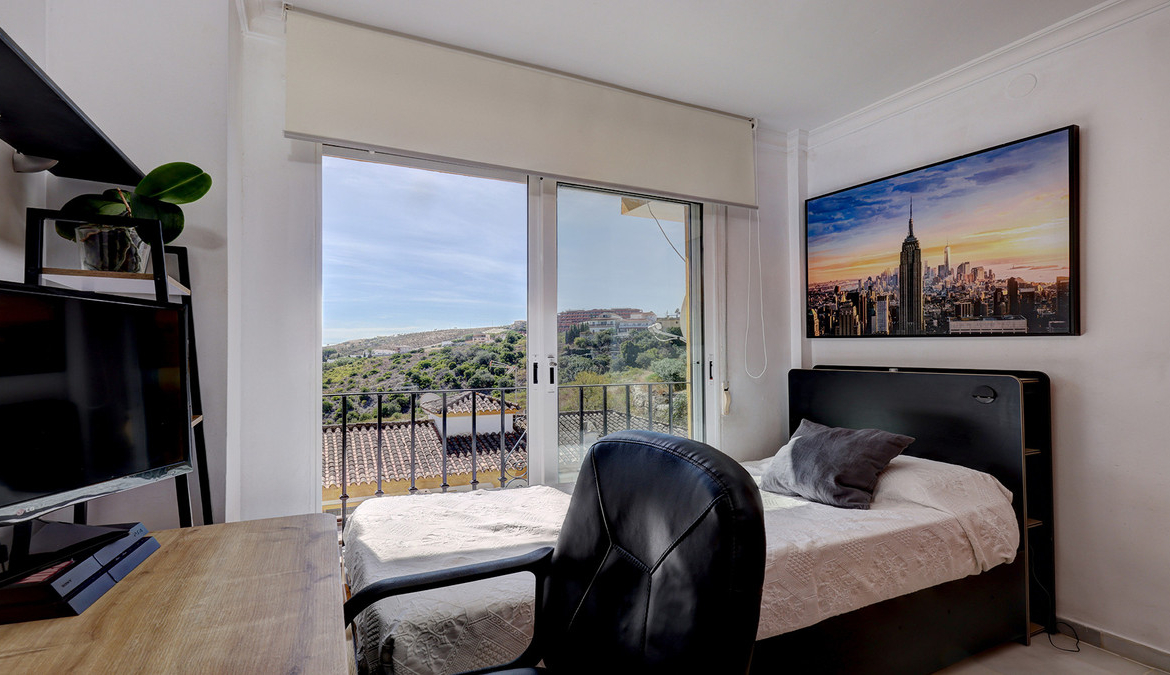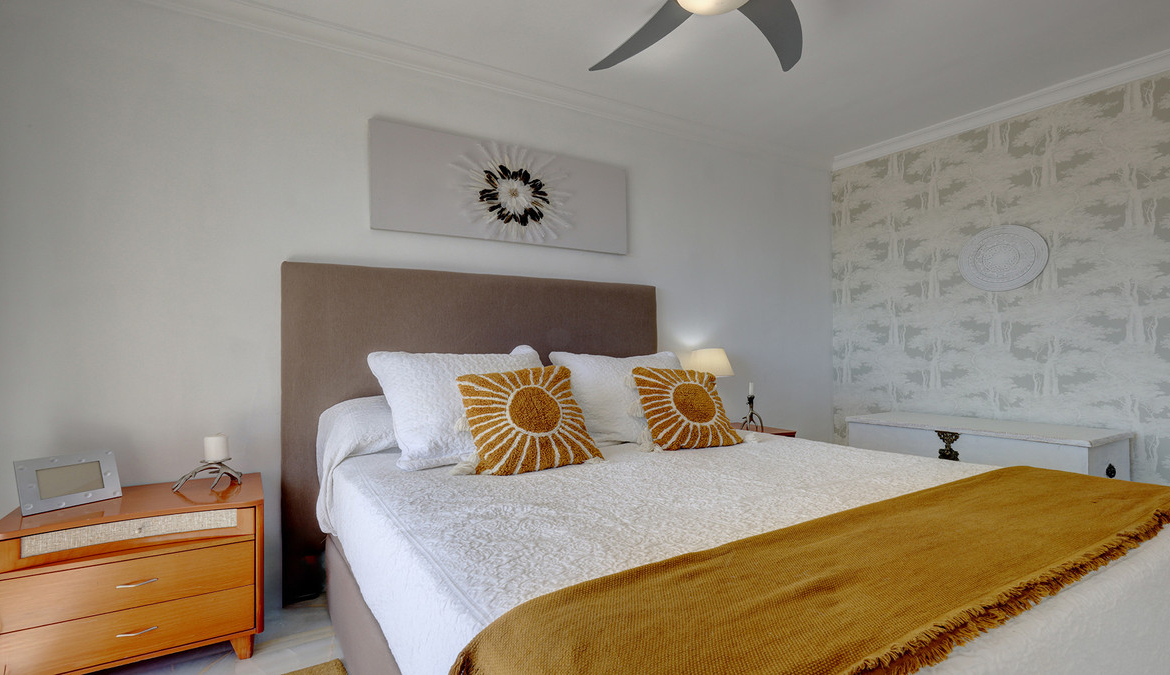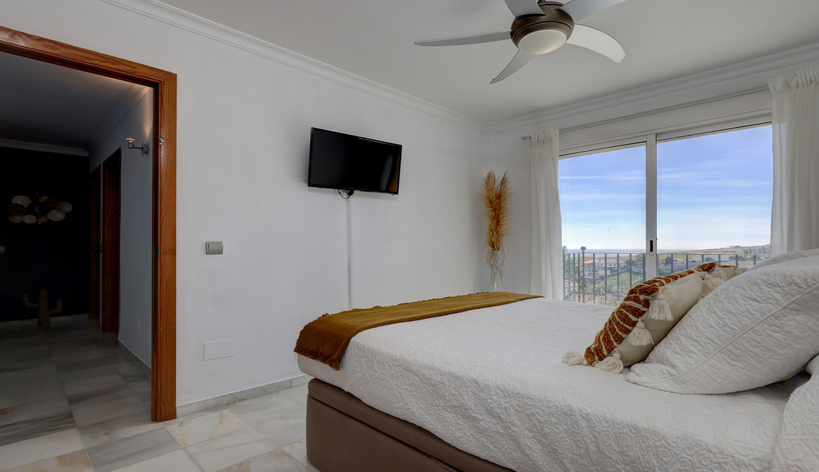 Første etasje er hjem til tre soverom og ett bad. Alle soverommene har balkongdører, er lyse og har utmerket utsikt. Hovedsoverommet har en walk-in garderobe og en balkong, er sørvendt og har fantastisk utsikt over havet og over til vingårder og fjell. Det andre soverommet har garderober, en Juliet balkong og har også fantastisk havutsikt. Familiebadet har blitt pusset opp og er moderne med walk-in dusj. Selv herfra er det fantastisk fjellutsikt til fjellkjeden Sierra Bermeja. Det tredje soverommet er et dobbelt soverom med garderober og egen terrasse. Utsikten er vakker over bassenget, over vingårdene og til sjøen.
