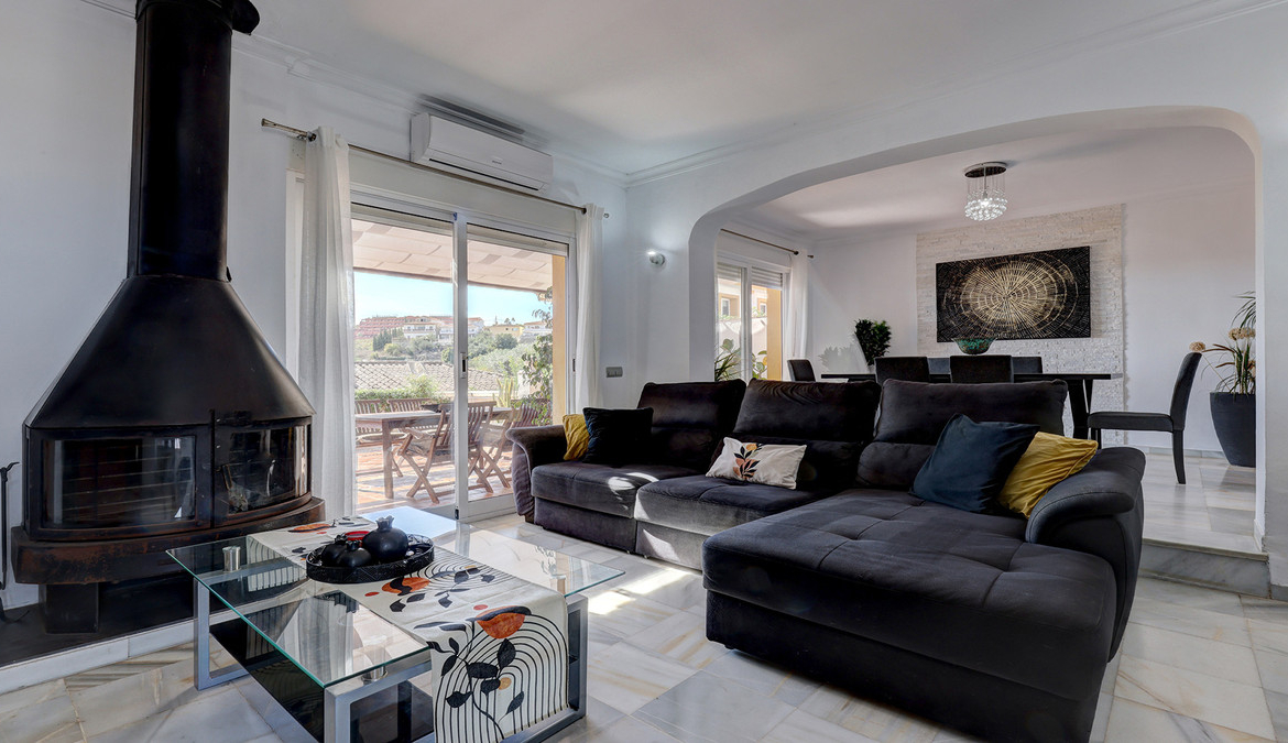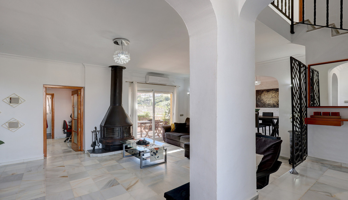 Når du kommer inn i huset er det en stor romslig stue / spisestue med delt nivå. Stuen har en vedfyring brann gjør det veldig koselig på vinterkvelder. Det finnes aircondition i salongen. Det er to sett med doble balkongdører som fører ut herfra til terrassen. Terrassen er et nydelig område med markise slik at du har skyggelagte og uskyggelagte områder. Et fantastisk sted å spise al fresco mens du suger opp fjelluften, og tar den vakre havutsikten. Det er også utsikt over felles svømmebassenget. Gjemt bort i hjørnet er tilgang til et vaskerom.