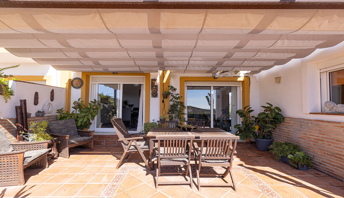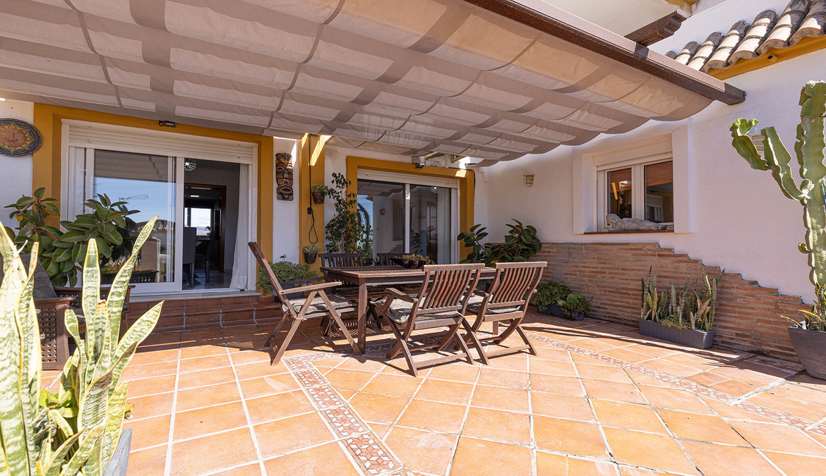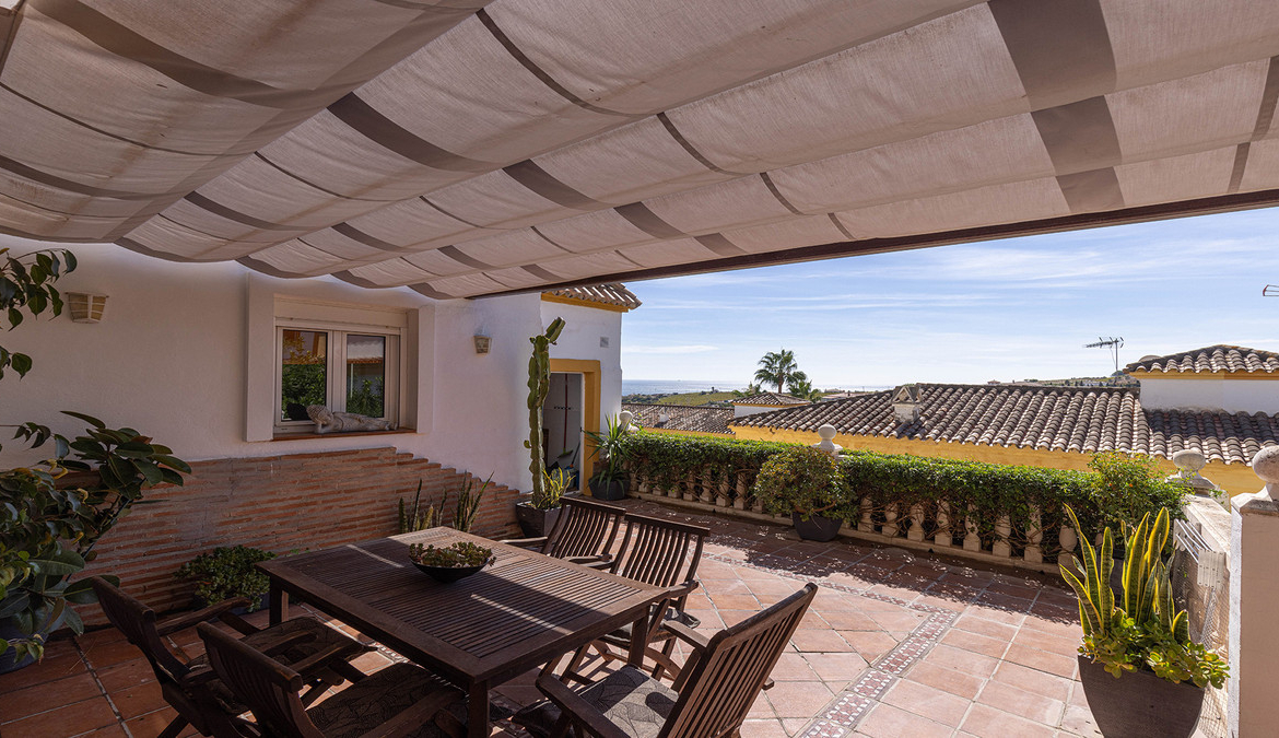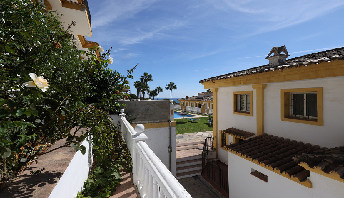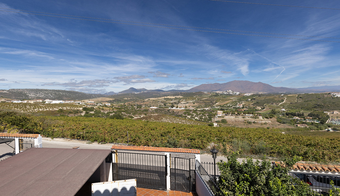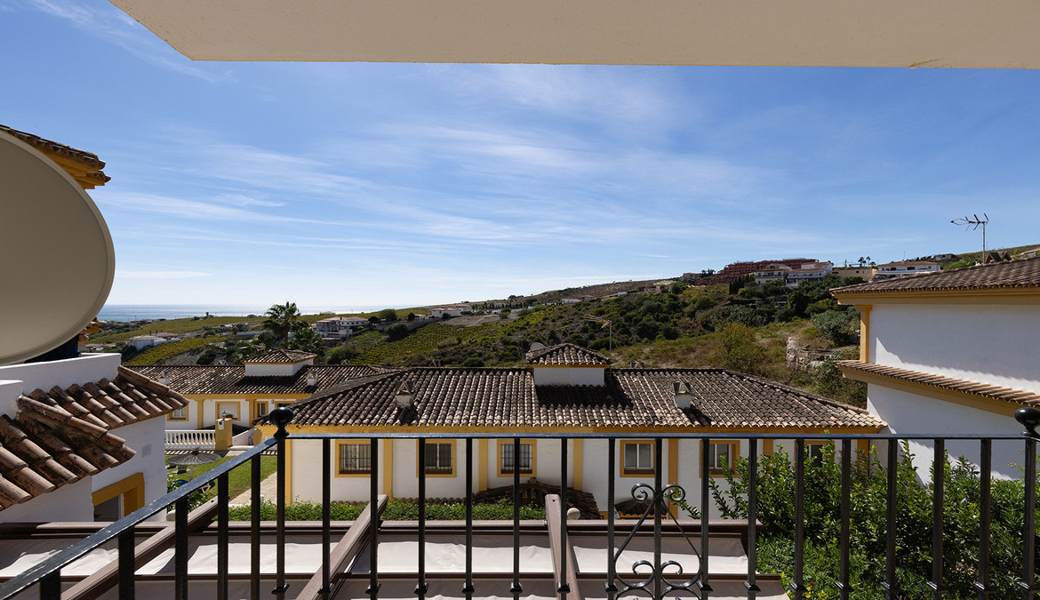 En fabelaktig andalusisk stil rekkehus i Manilva Village med fantastisk panoramautsikt over vingårdene, over til fjellene og havet. En oppsiktsvekkende setting. Ligger i en liten urbanisering av bare 23 hus med felles svømmebasseng og hager.