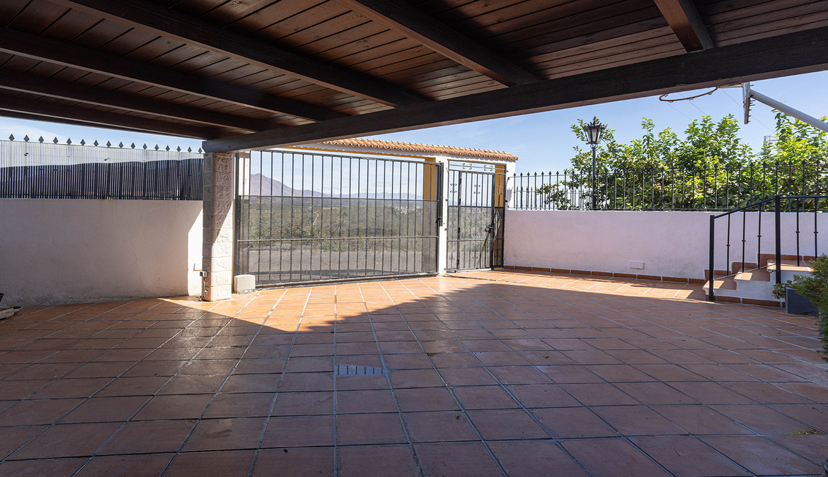 Det er en inngangsport for biler og en gågate for å komme inn i eiendommen. Du går inn i eiendommen til en stor gårdsplass med carport hvor du kan passe minst tre biler. Fra terrassen / gårdsplassen er det trinn som fører ned til en kjeller og trapper som fører opp til hovedhuset.