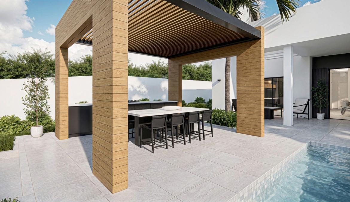 • zadaszony pawilon grillowy o powierzchni 18 m2 z żaluzjowym dachem i chowanymi bokami – wyposażony w grill gazowy, zlewozmywak, zmywarkę, lodówkę, generator wody, kran do piwa, ekspres do kawy, ekspres do lodu, stół, krzesła i telewizor 75"