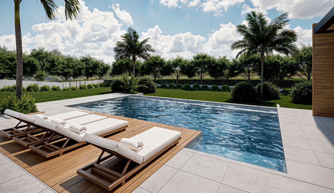 • Tropikalny ogród o niskiej konserwacji – z wysokiej jakości sztuczną trawą, roślinami tropikalnymi i palmami