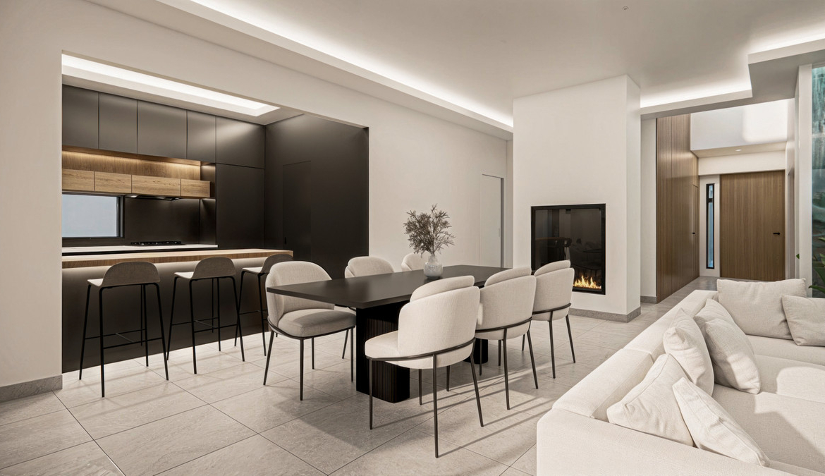 • Przestronna i jasna otwarta przestrzeń mieszkalna – z kominkiem i dużymi oknami, które płynnie łączą pomieszczenia wewnętrzne i zewnętrzne, zalewając wnętrze naturalnym światłem.