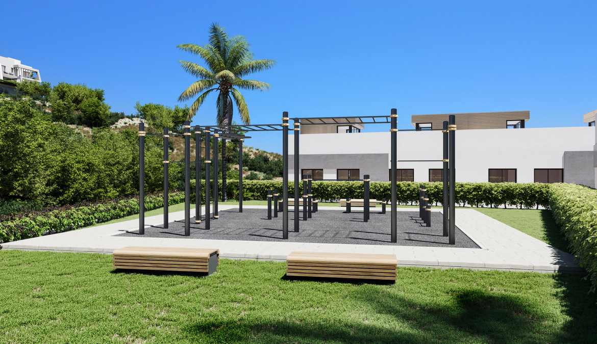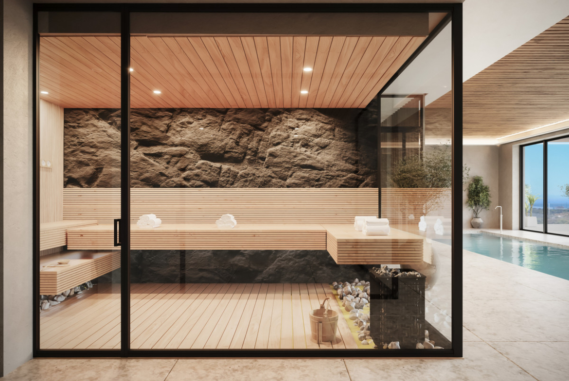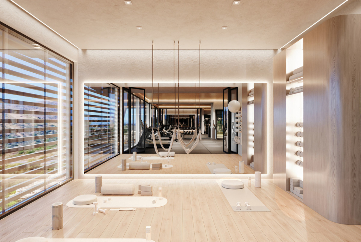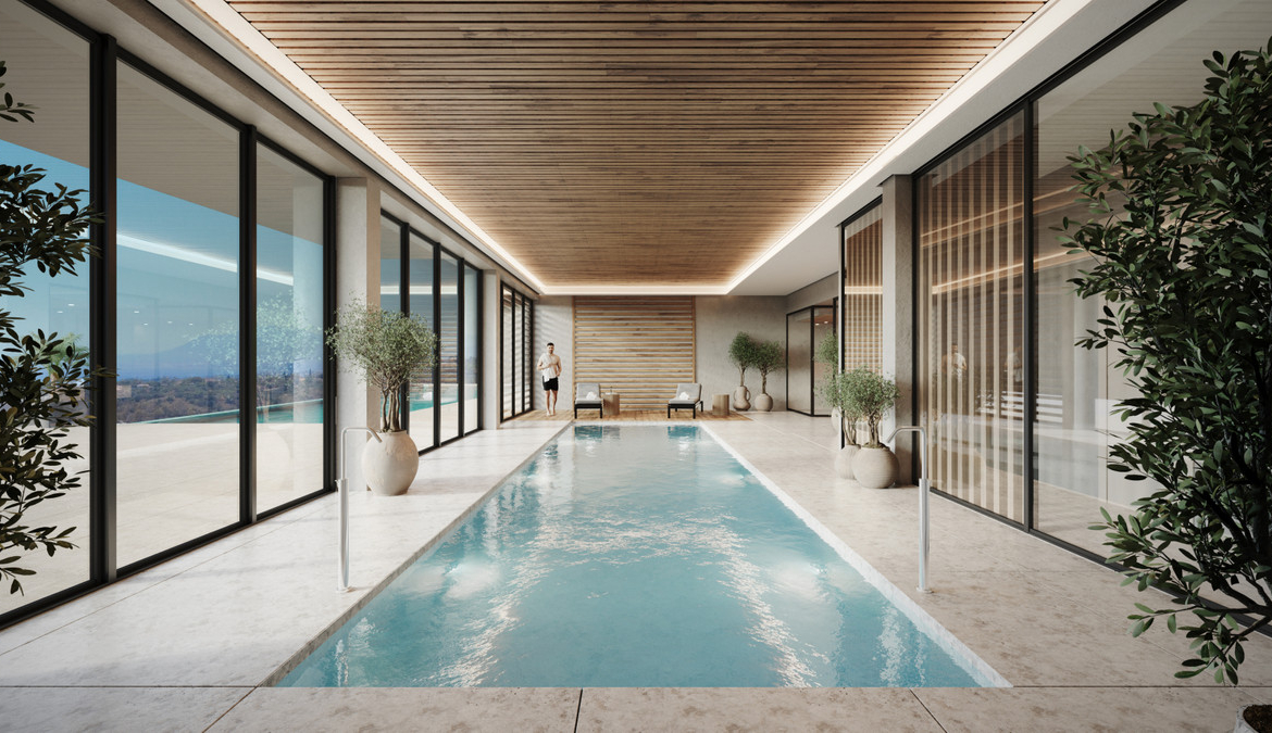 Residents benefit from a comprehensive wellness and leisure offering, including a heated semi-Olympic outdoor pool, heated indoor pool, fully equipped gym with yoga and Pilates studio, sauna, hammam, and hydrotherapy area with ice buckets. Outdoor facilities include five dedicated sports and wellness areas, multiple yoga and calisthenics zones, an outdoor bar with Balinese beds, and landscaped communal spaces. The development also features 24-hour security for peace of mind.