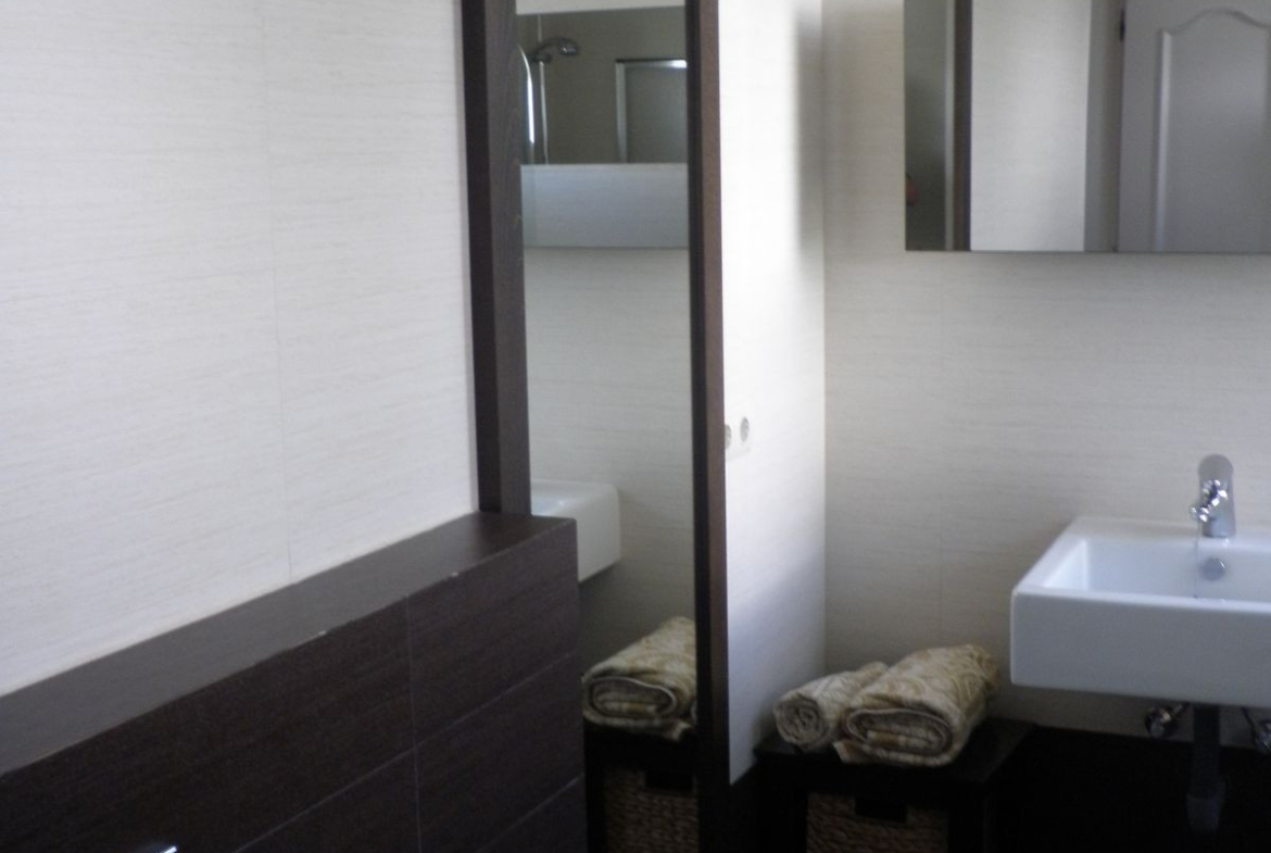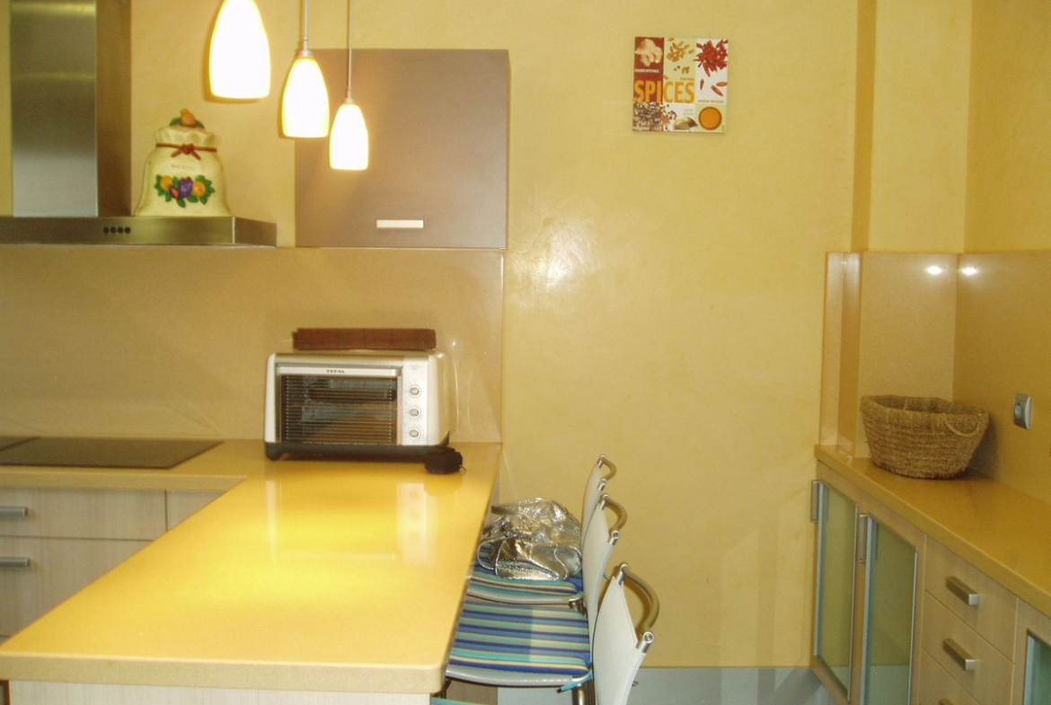 Spacious Layout Across Three Floors: Entrance hall, guest toilet, large modern fully equipped kitchen, and a generous living/dining room with direct access to a private garden and the community pool.