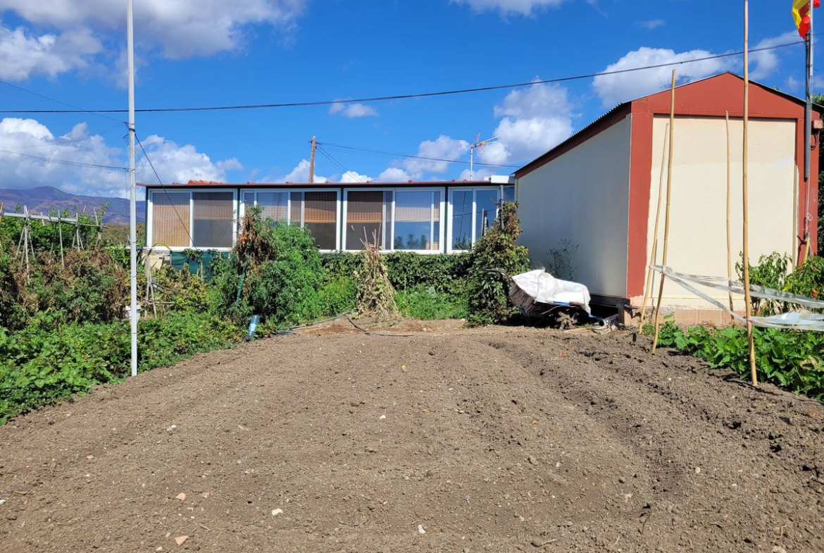 Parking area for three cars. Container and chicken coop. The orchard is about 200 square meters.