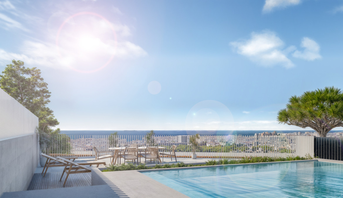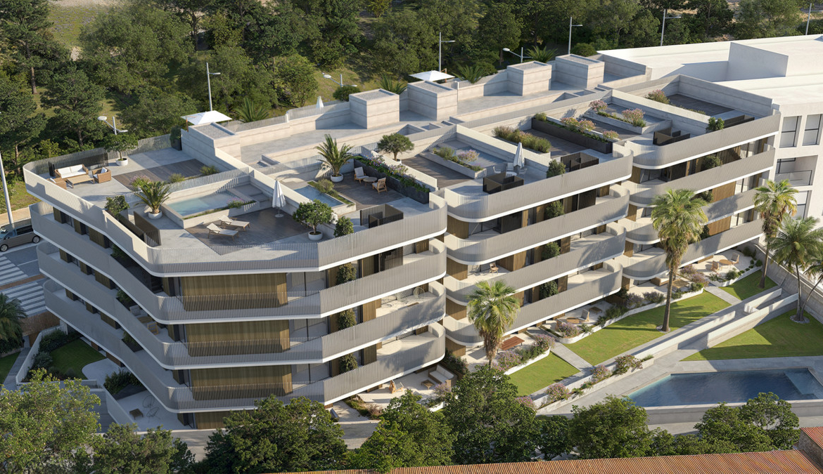 The apartments are available with 2 bedrooms and 2 bathrooms, one of which is en-suite, and have large terraces to make the most of the views. Each home has a fully equipped kitchen with appliances, air conditioning, heating and double glazing. The penthouses have a solarium and a private swimming pool on the roof, adding an extra dimension to luxury living.