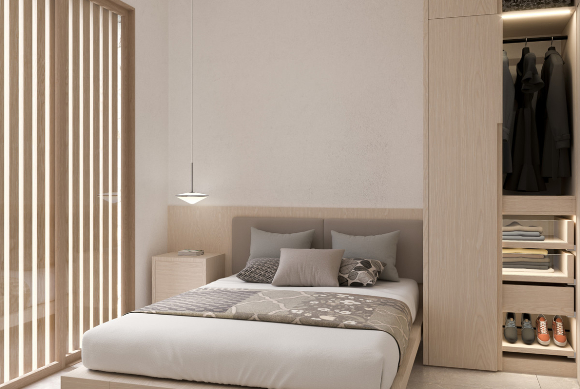 The architecture combines natural materials such as natural stone and wood with sleek lines and warm finishes.