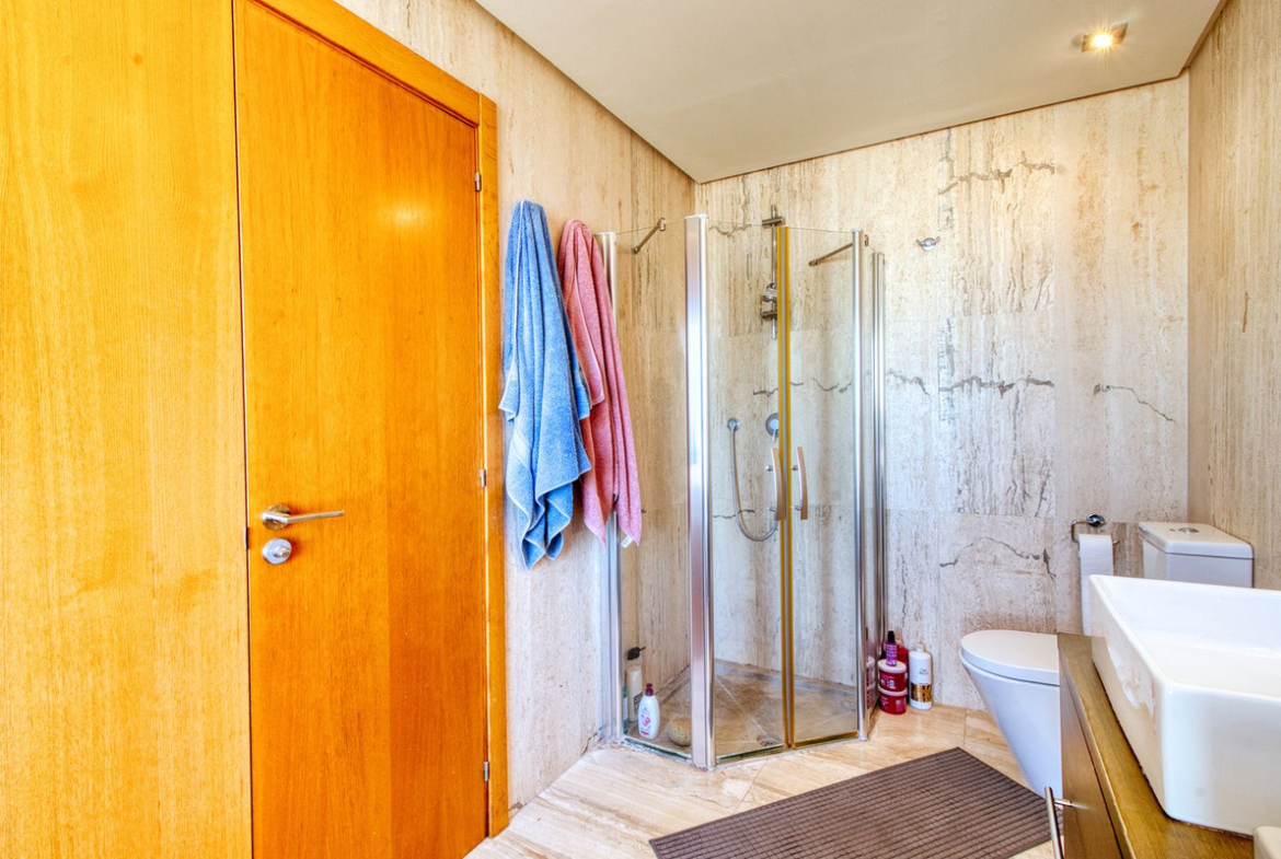 On the ground floor, you will find a bright living and dining area, a fully equipped kitchen, and a guest toilet. A large terrace extends from the living space, perfect for enjoying the Mediterranean breeze. The first floor features two generously sized bedrooms, each with its own ensuite bathroom and one with private balcony. The lower level adds versatility, currently used as a third bedroom, and also includes a separate laundry room for extra convenience.