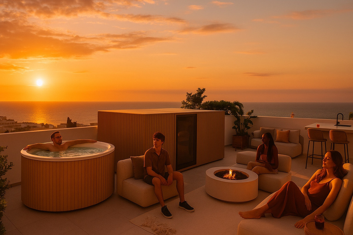 Step into resort-style living: a sparkling communal pool set among manicured gardens, plus your own private rooftop solarium with breathtaking Mediterranean views.